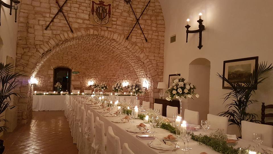 Giangirolamo II Acquaviva d’Aragona, detto, tardivamente e infondatamente, il “Guercio di Puglia”, fu il più potente feudatario della Puglia del XVII sec., fondatore di Alberobello, noto per la maestria nell’uso delle armi, per il coraggio e per il suo raffinato mecenatismo. A soli 17 anni, a capo di 300 cavalieri, difese Manfredonia dai Turchi (1620). Pur essendo il principale referente della fazione filofrancese del Regno di Napoli, si schierò a difesa del governo spagnolo nei moti del 1647 e 1648 che, iniziati con la rivolta di Masaniello a Napoli, si propagarono rapidamente, assumendo anche un carattere antifeudale. Alla illuminata committenza di Giangirolamo II si devono, fra l’altro, le 10 tele raffiguranti episodi de La Gerusalemme Liberata, del pittore napoletano Paolo Finoglio, che egli chiamò a corte intorno al 1620, nonché la fastosa chiesa di San Cosmo, ricca di tele dello stesso pittore, di stucchi e affreschi di suoi allievi. A lui e a sua moglie Isabella Filomarino di Roccadaspide, si deve l’ampliamento del “castello di Marchione”, come si ricava dallo stemma dipinto sul soffitto. Con Giangirolamo II, alla contea di Conversano fu aggregato il ducato di Nardò, pervenutogli per eredità materna e, per parte di Isabella, il feudo di Palo [del Colle], acquistato da suo padre Tommaso Filomarino. Dopo la morte di Giangirolamo II e con il trasferimento della famiglia a Napoli, la contea di Conversano si avviò verso una lenta decadenza. Nel XIX sec. il castello divenne masseria. L’edificio fu acquisito dal cavaliere Andrea Acquaviva d’Aragona, il quale lo lasciò a suo nipote Francesco, duca di Nardò, padre della principessa Giulia Acquaviva d’Aragona, moglie del principe di Boiano e duca di Monasterace Giustiniano Tomacelli Filomarino. La principessa avviò una paziente opera di restauro. Tale opera di salvaguardia e valorizzazione fu proseguita con amore, competenza e impegno dal figlio, principe di Boiano e duca di Monasterace don Fabio Tomacelli Filomarino (1920-2003), decorato anche con i titoli di Casa Henriquez e, per parte materna, di quelli di Casa Acquaviva d’Aragona. Uomo di grande e profonda religiosità, sempre attento ai bisogni ed alle sofferenze della gente, autentico testimone di uno straordinario stile di vita, ultimo discendente di Casa Acquaviva d’Aragona. Al piano superiore dell’edificio, i soffitti, originariamente in legno e dipinti, furono sostituiti nel XIX sec. con volte in muratura, eccezion fatta per il soffitto del salone centrale, dove è raffigurato lo stemma inquartato della Casa Acquaviva d’Aragona (blasonatura: nel 1° e 4°, contrainquartato in palo: a) d’oro a quattro pali di rosso (Aragona); b) fasciato di rosso e d’argento di otto pezzi (Ungheria); d) d’azzurro, seminato di gigli d’oro (Angiò); e) d’argento, alla croce patente d’oro, accantonata da quattro crocette dello stesso (Gerusalemme); nel 2°, partito, 1° di verde, a tre bande di rosso bordate d’argento (Filomarino); 2°, d’azzurro, alla banda d’argento bordata di nero (di Capua); nel 3°, d’oro, al leone rampante d’azzurro (Acquaviva). Al punto d’onore, Acquaviva.). Nel salone si osservano, sulla parete sinistra, due alberi genealogici dipinti su tela: il primo è della Casa Acquaviva d’Aragona, il secondo è quello della Casa Enriquez (Casa reale di Castiglia, di cui un ramo si è estinto nella Casa Filomarino), principi di Cutrofiano e Squinzano, marchesi di Salice [Salentino] e di Campi [Salentina]; sulla parete opposta un dipinto ad olio raffigura, forse, Giangirolamo II. Sulle pareti più in basso, dei “medaglioni” dipinti ad olio su rame, raffigurano vari duchi di Casa Acquaviva, un ritratto del cardinale Troiano Acquaviva d’Aragona, ramo d’Atri, oltre a due tondi raffiguranti Ascanio e Scipione Filomarino, i ritratti del re Filippo V di Spagna e di sua moglie Elisabetta Farnese, un probabile ritratto di mons. Francesco Acquaviva d’Aragona e uno del duca Francesco Tomacelli e stampe raffiguranti alcuni cardinali appartenenti alla Casata. In una stanza attigua, un quadro raffigura la contessa Isabella Filomarino di Roccadaspide, moglie di Giangirolamo II, che resse la contea durante le assenze del consorte e alla cui pia volontà si deve la costruzione della chiesa del Carmine a Conversano (1652). Vi sono qui anche riproduzioni di opere di Tiziano Vecellio e di Paris Bordon, raffiguranti rispettivamente Gianfrancesco II e Giulio Antonio II Acquaviva d’Aragona, nonché immagini del castello di Conversano e della camera con alcova di Giangirolamo II e di Isabella, decorata con stucchi e affreschi, prima opera da loro commissionata a Paolo Finoglio.