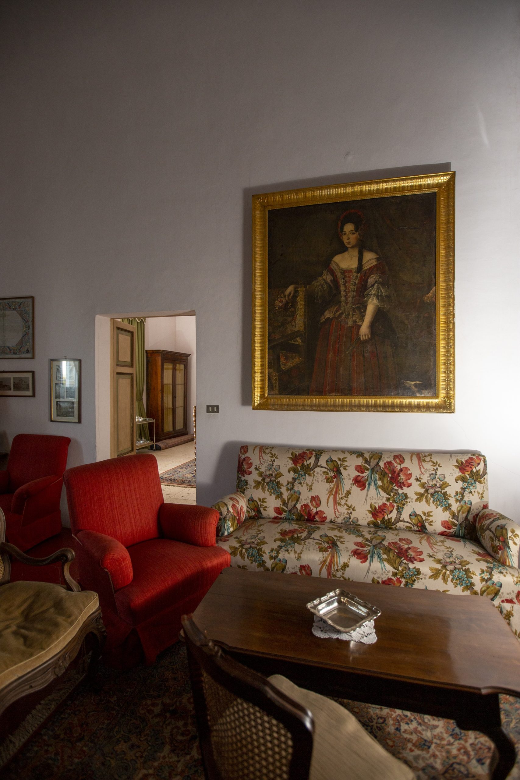 Nel salone si osservano, sulla parete sinistra, due alberi genealogici dipinti su tela: il primo è della Casa Acquaviva d’Aragona, il secondo è quello della Casa Enriquez (Casa reale di Castiglia, di cui un ramo si è estinto nella Casa Filomarino), principi di Cutrofiano e Squinzano, marchesi di Salice [Salentino] e di Campi [Salentina]; sulla parete opposta un dipinto ad olio raffigura, forse, Giangirolamo II. Sulle pareti più in basso, dei “medaglioni” dipinti ad olio su rame, raffigurano vari duchi di Casa Acquaviva, un ritratto del cardinale Troiano Acquaviva d’Aragona, ramo d’Atri, oltre a due tondi raffiguranti Ascanio e Scipione Filomarino, i ritratti del re Filippo V di Spagna e di sua moglie Elisabetta Farnese, un probabile ritratto di mons. Francesco Acquaviva d’Aragona e uno del duca Francesco Tomacelli e stampe raffiguranti alcuni cardinali appartenenti alla Casata.