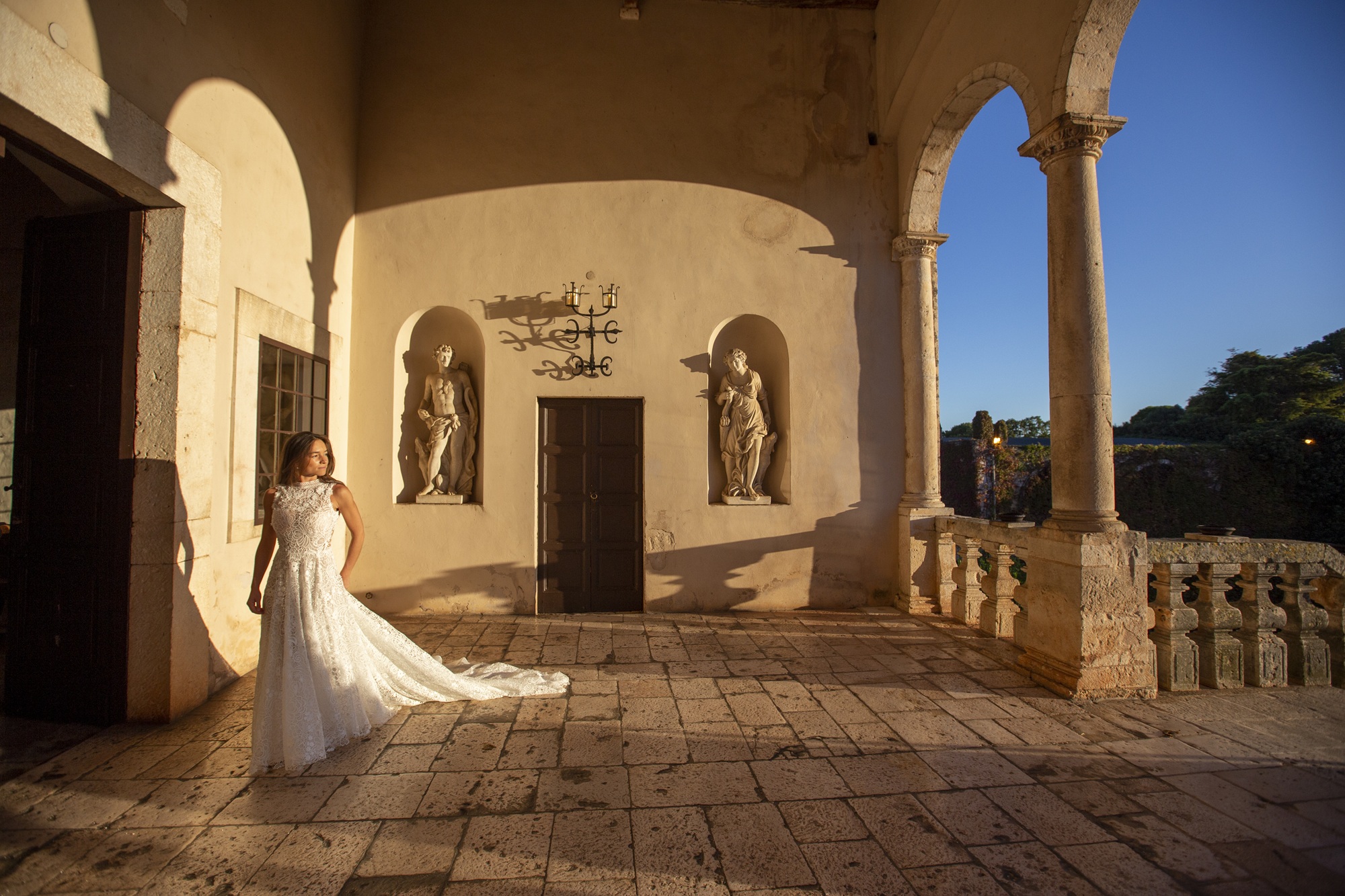 La costruzione fu soprelevata a metà del Seicento, con una struttura che richiama i palazzi veneziani, con le quattro torri originarie abbassate e collegate a balconi angolari: l’originaria struttura difensiva si aprì, con due logge contrapposte, sulla lussureggiante campagna circostante. L’origine degli Acquaviva risale a Rinaldo, signore di Atri, vissuto intorno all’anno Mille, uno dei grandi feudatari dell’Abruzzo Teramano, nel 1479 aggregati alla famiglia reale dei re aragonesi di Napoli, con il privilegio di inquartare il loro stemma e, pertanto, da allora detti Acquaviva d’Aragona: una delle più importanti famiglie del Regno di Napoli.